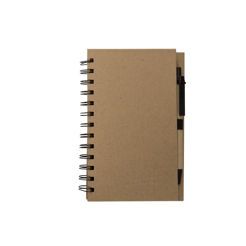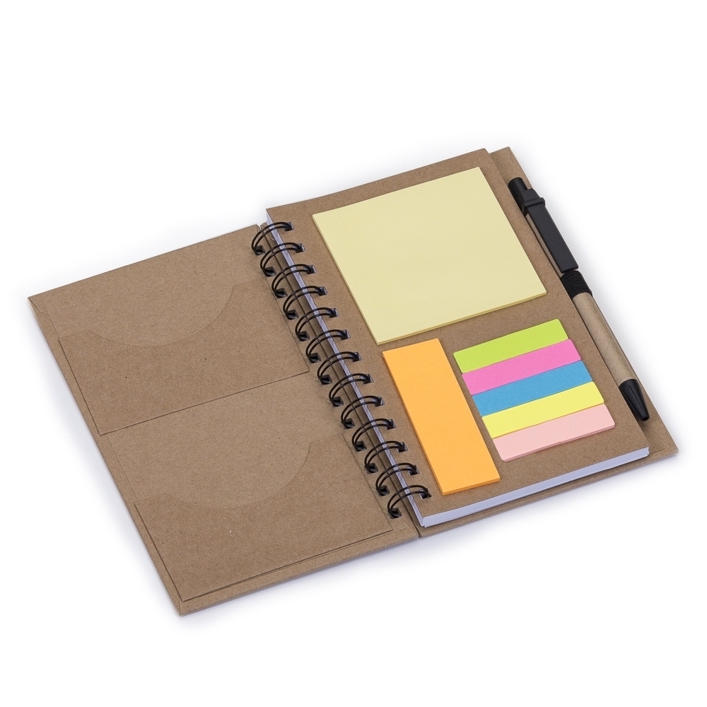 Bloco de anotações ecológico com caneta e autoadesivos. Bloco com dois suporte internos para cartão, possui cinco blocos autoadesivos com 20 folhas cada, bloco laranja e bloco amarelo com aproximadamente 20 folhas cada. Possui aproximadamente 70 folhas brancas pautadas e caneta de papelão de clip e ponteira plástica.