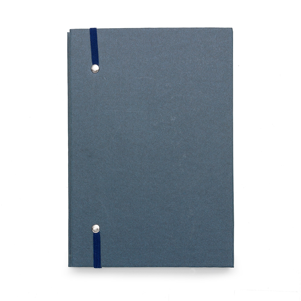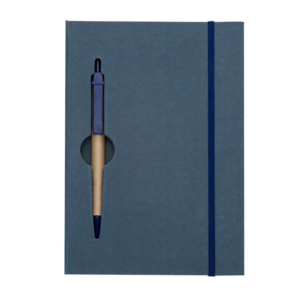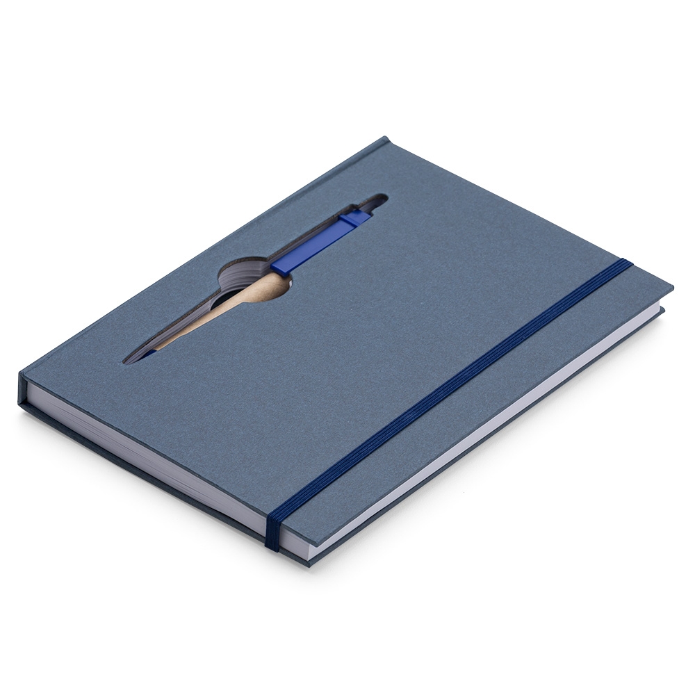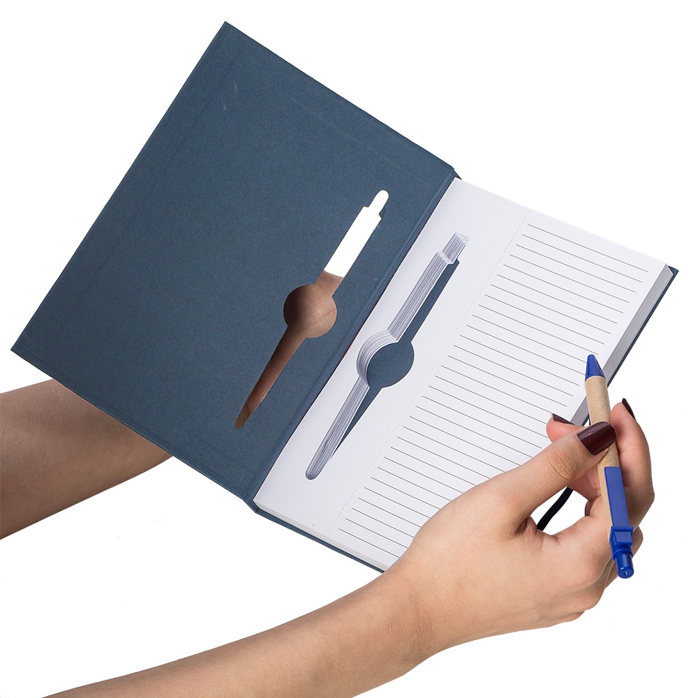 Bloco de anotações ecológico com capa e miolo vazados, utilizados como suporte para a caneta. Bloco com miolo de picote, elástico para lacre e caneta de papelão com detalhes plásticos, carga esferográfica na cor azul e acionamento por clique.