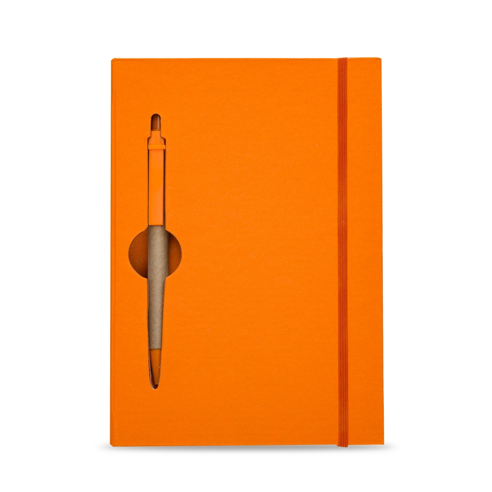 Bloco de anotações ecológico com capa e miolo vazados, utilizados como suporte para a caneta. Bloco com miolo de picote, elástico para lacre e caneta de papelão com detalhes plásticos, carga esferográfica na cor azul e acionamento por clique.