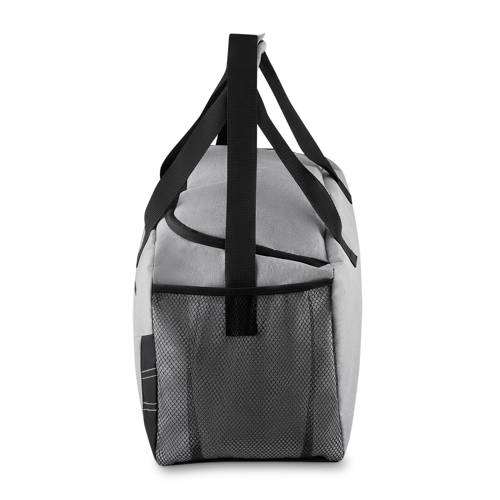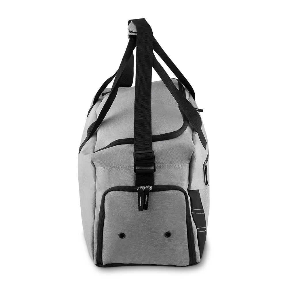 Bolsa esportiva de poliéster. Possui bolso frontal, bolso lateral de malha, bolso lateral com zíper para calçados e bolso grande superior. Alça de mão com pegador cinza de velcro e alça ajustável para as costas.