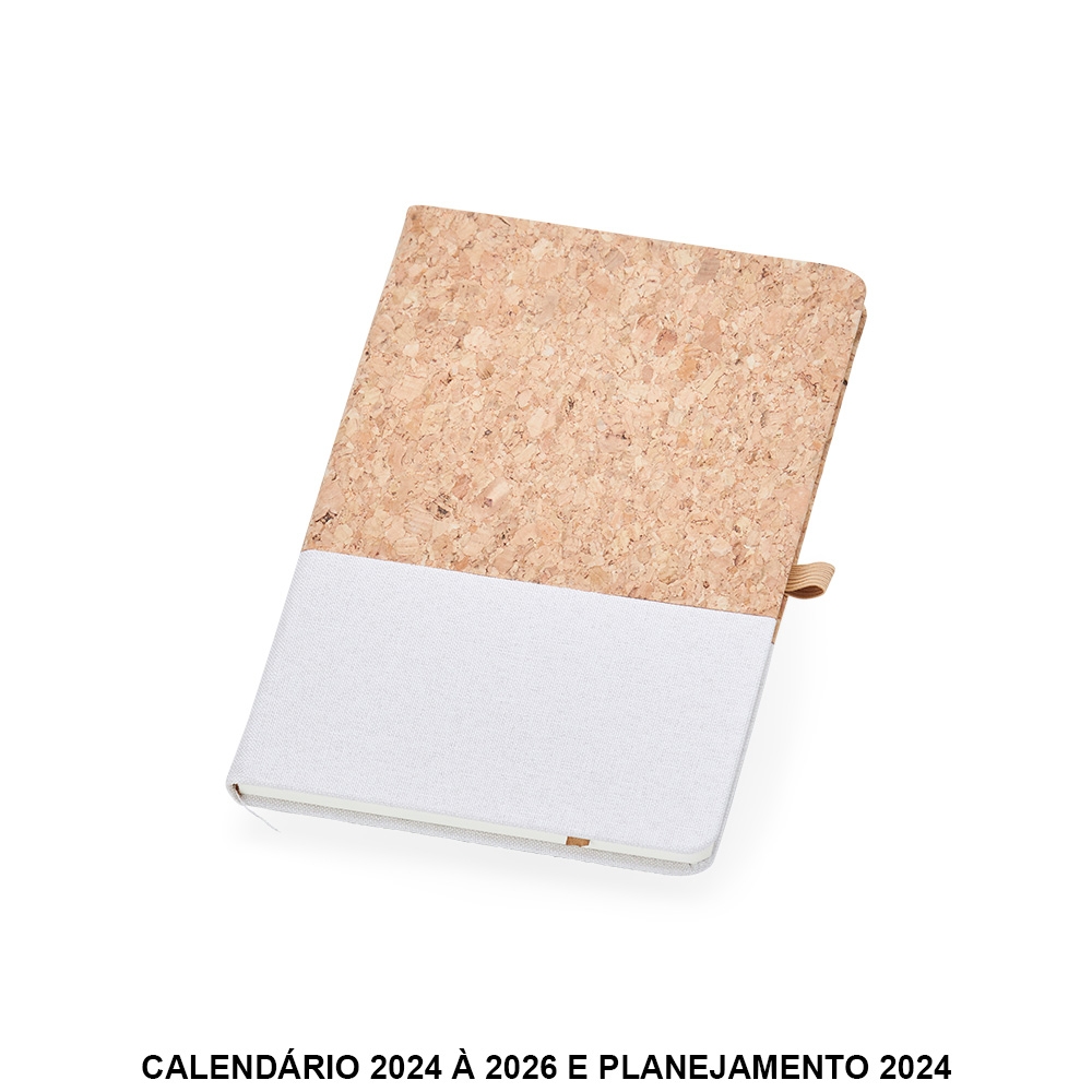 Caderneta A5 de cortiça com detalhe em linho e suporte para caneta, contém marcador de página em cetim, página para dados pessoais, calendário, páginas de planejamento e aproximadamente 92 folhas marfim com pauta.