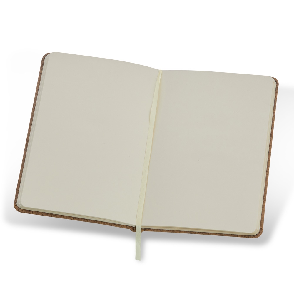 Caderneta em cortiça, possui marca página em cetim e elástico para lacre. Contém aproximadamente 80 folhas marfim sem pauta.