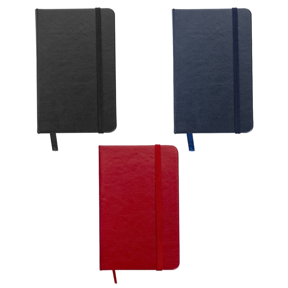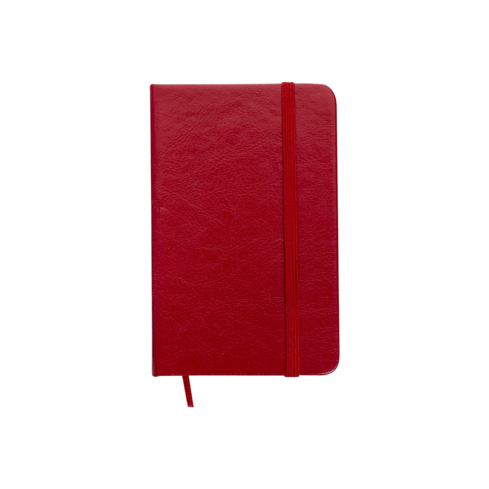 Caderneta de couro sintético com elástico para lacre e marcador de página em cetim, contém 80 folhas sem pauta.