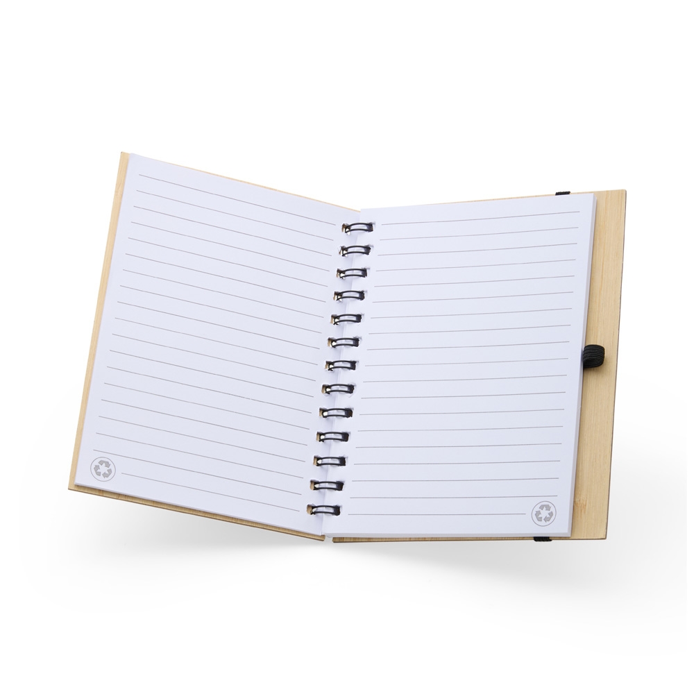 Caderneta ecológica com caneta. Capa de bambu. Possui aproximadamente 70 folhas brancas pautadas com logo reciclado na lateral inferior. Acompanha suporte elástico de nylon com uma caneta de papelão de detalhes plásticos.