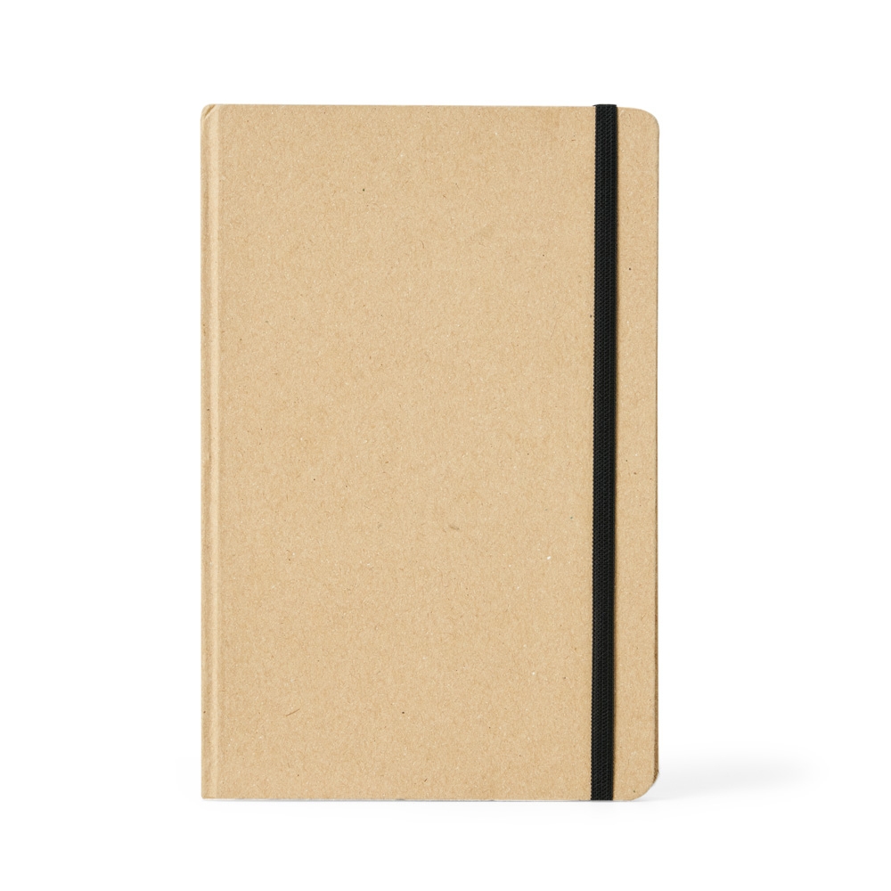 Caderneta de kraft com marca página em cetim e elástico para lacre. Contém aproximadamente 80 folhas marfim sem pauta.