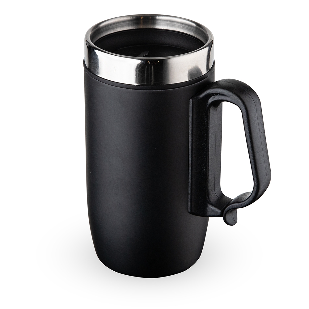 Caneca 250 ml parede dupla em Inox, com pegador de plástico, contém tampa com compartimento que ao deslizar, pode ser aberto para beber e base com EVA antiderrapante.