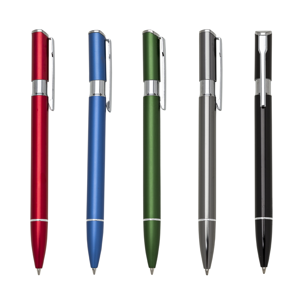 Caneta alumínio, carga esferográfica azul e acionamento por clique.