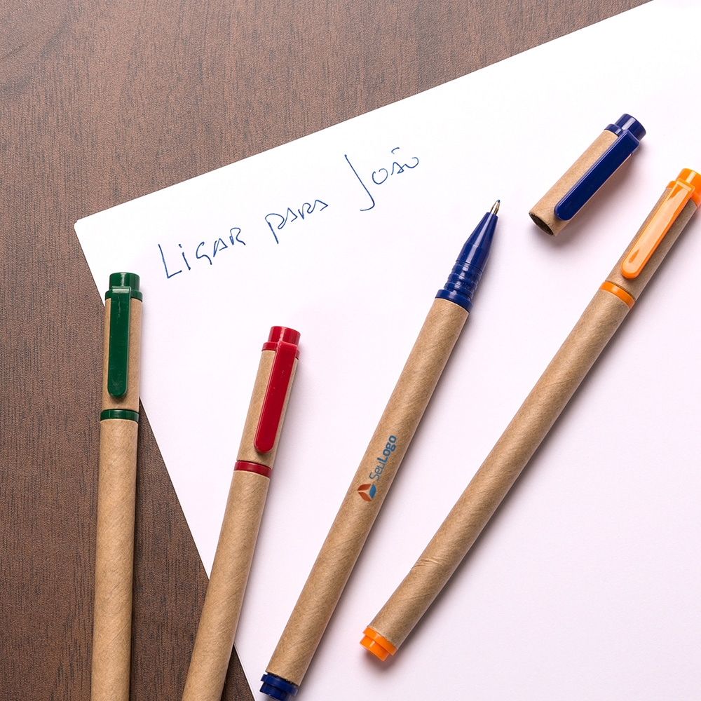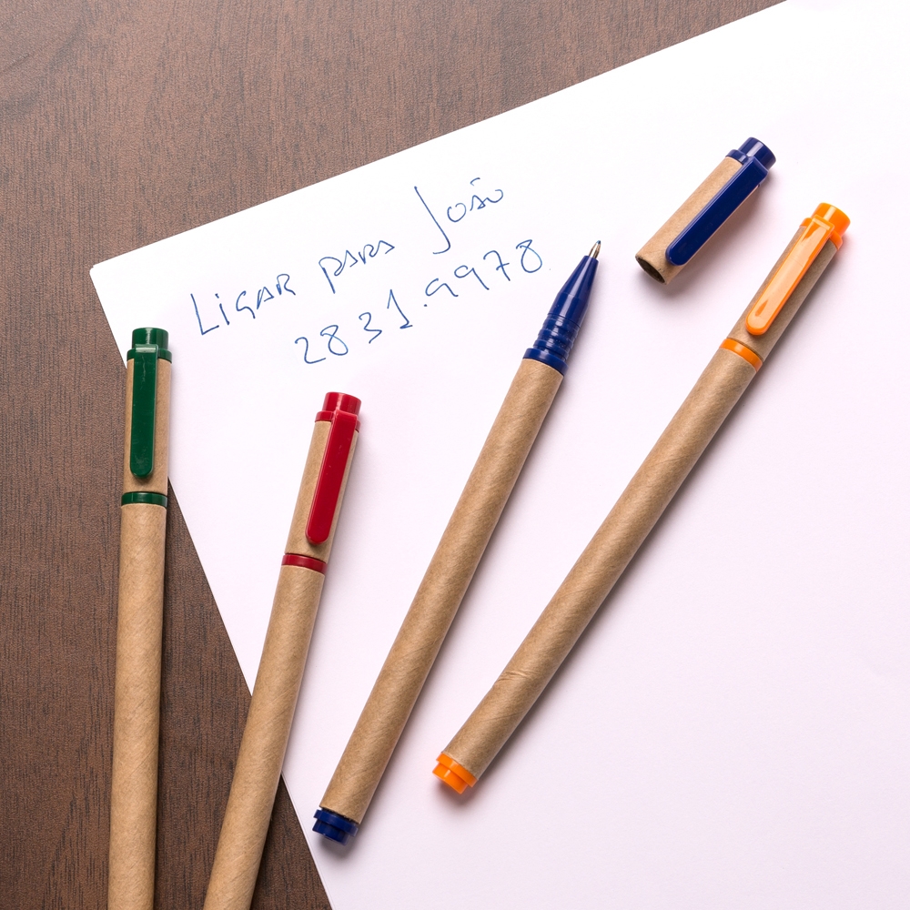 Caneta ecológica de papelão com tampa e detalhes plásticos, carga rollerball azul.
