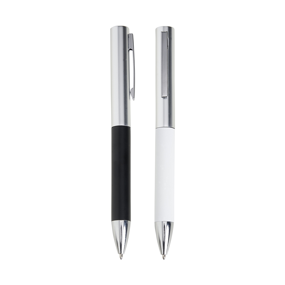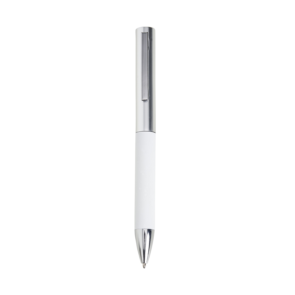 Caneta metálica com carga esferográfica azul e acionamento por rotação.