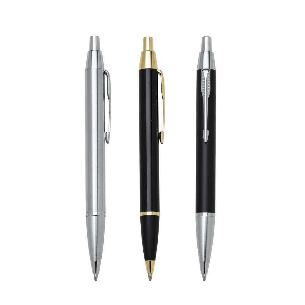 Caneta metálica com carga esferográfica azul e acionamento por clique. OBS.: PEDIDO APENAS MÚLTIPLO DE 50 PEÇAS!