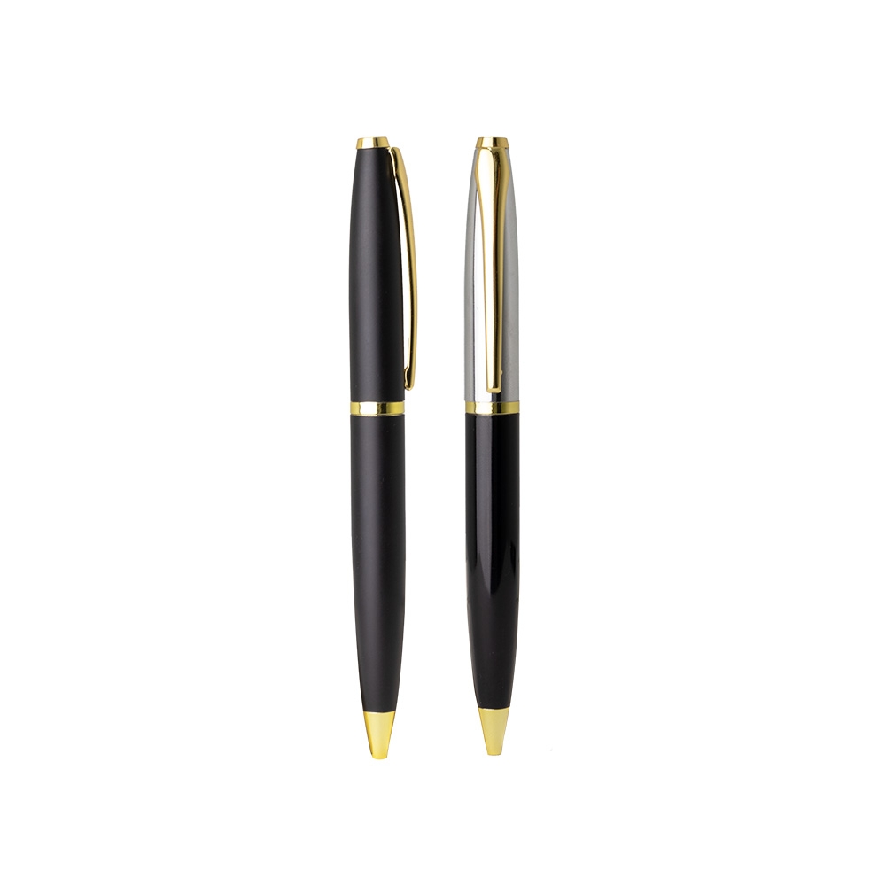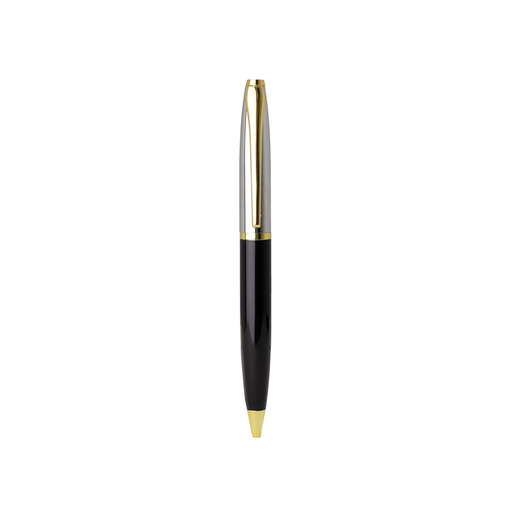 Caneta metálica com carga esferográfica azul 1.0mm e acionamento por rotação.