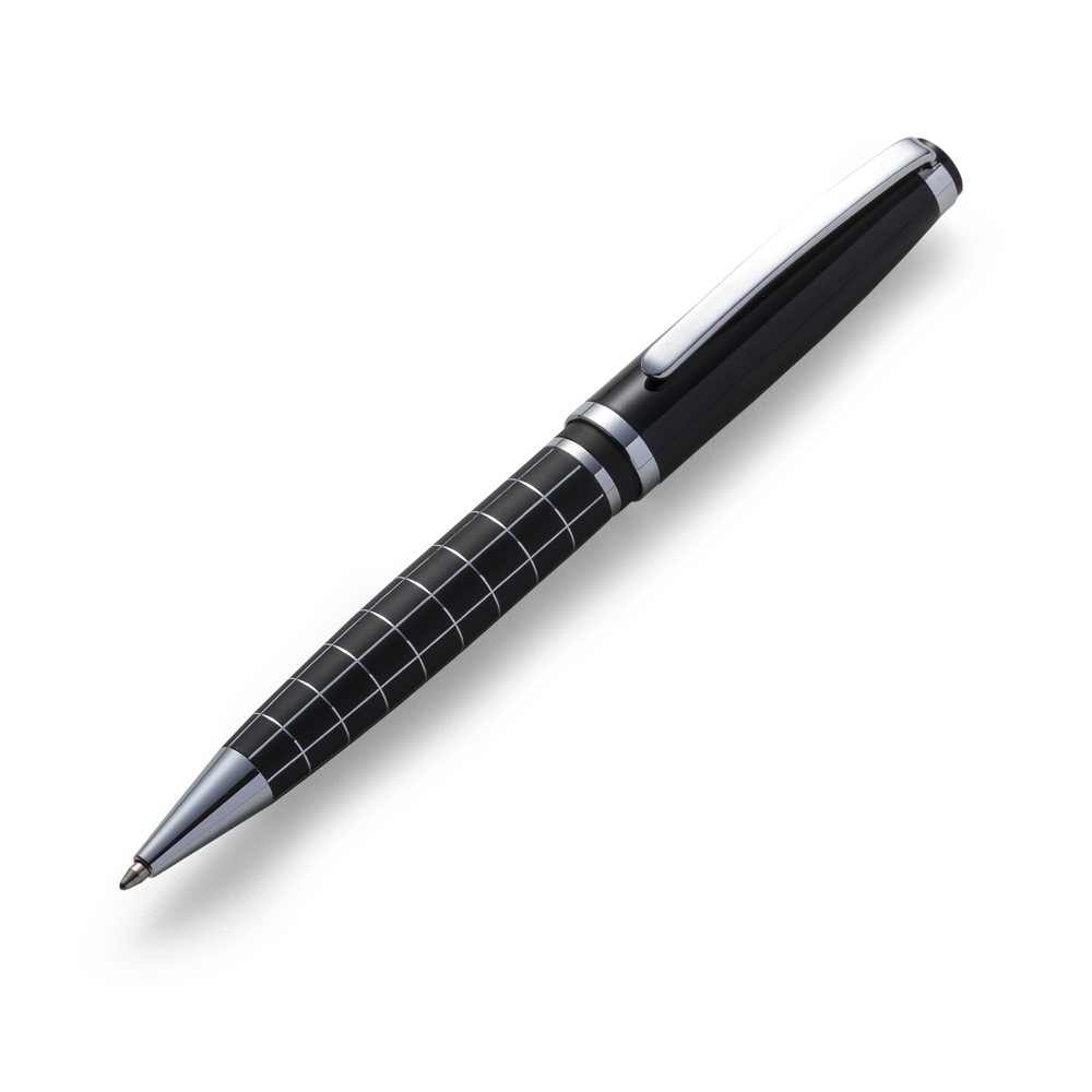 Caneta metal inteira preta com detalhes prata e quadriculados. Clip metal com anel superior e dois anéis centrais prata(detalhe preto entre eles). Aciona por giro. OBS.: PEDIDO APENAS MÚLTIPLO DE 50 PEÇAS!