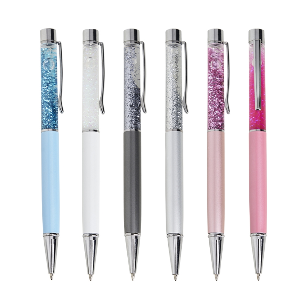 Caneta metálica com glitter, acionamento por rotação e carga esferográfica 1.0mm azul.
