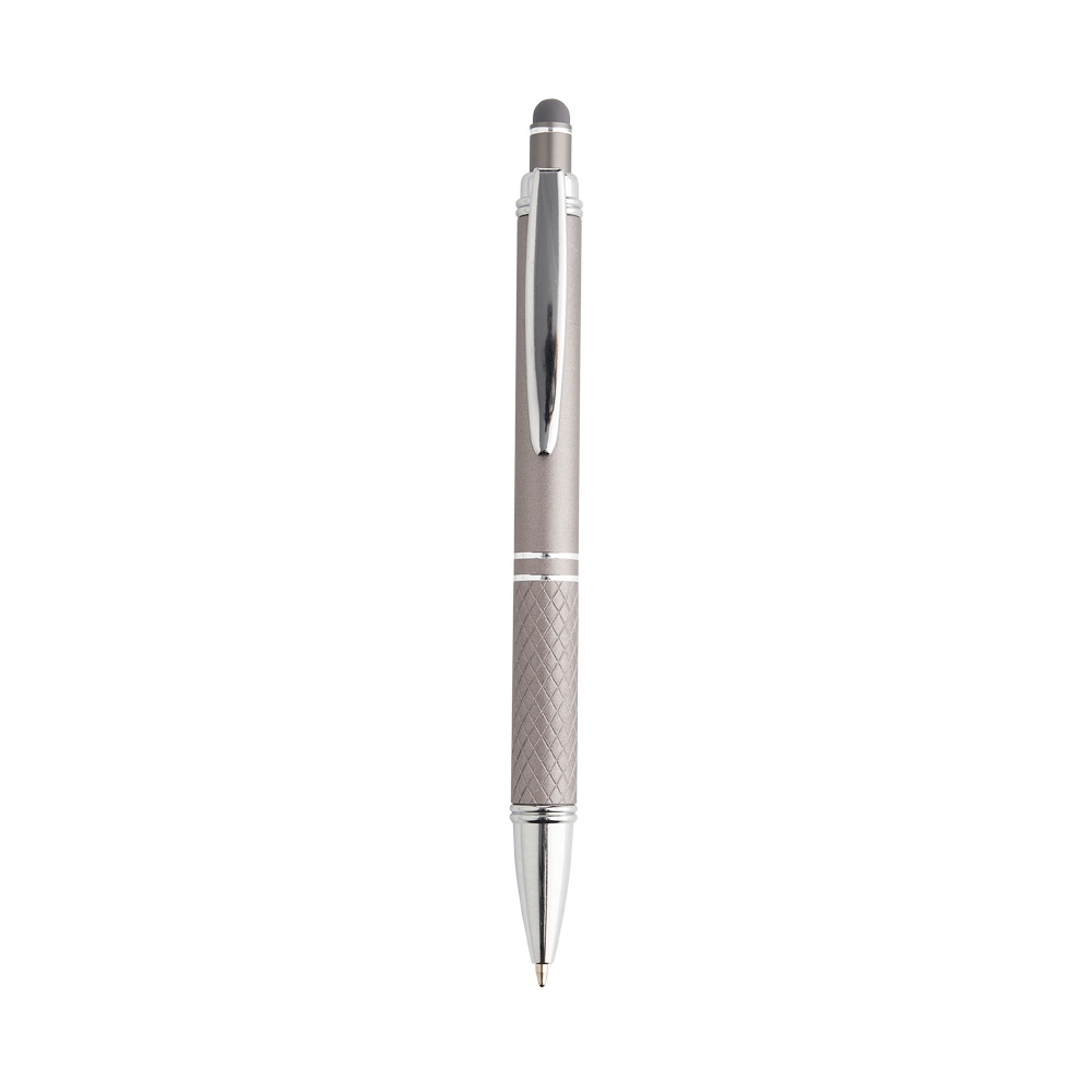 Caneta metálica touchscreen com parte inferior texturizada, acionamento por clique e carga esferográfica azul 1.0mm.