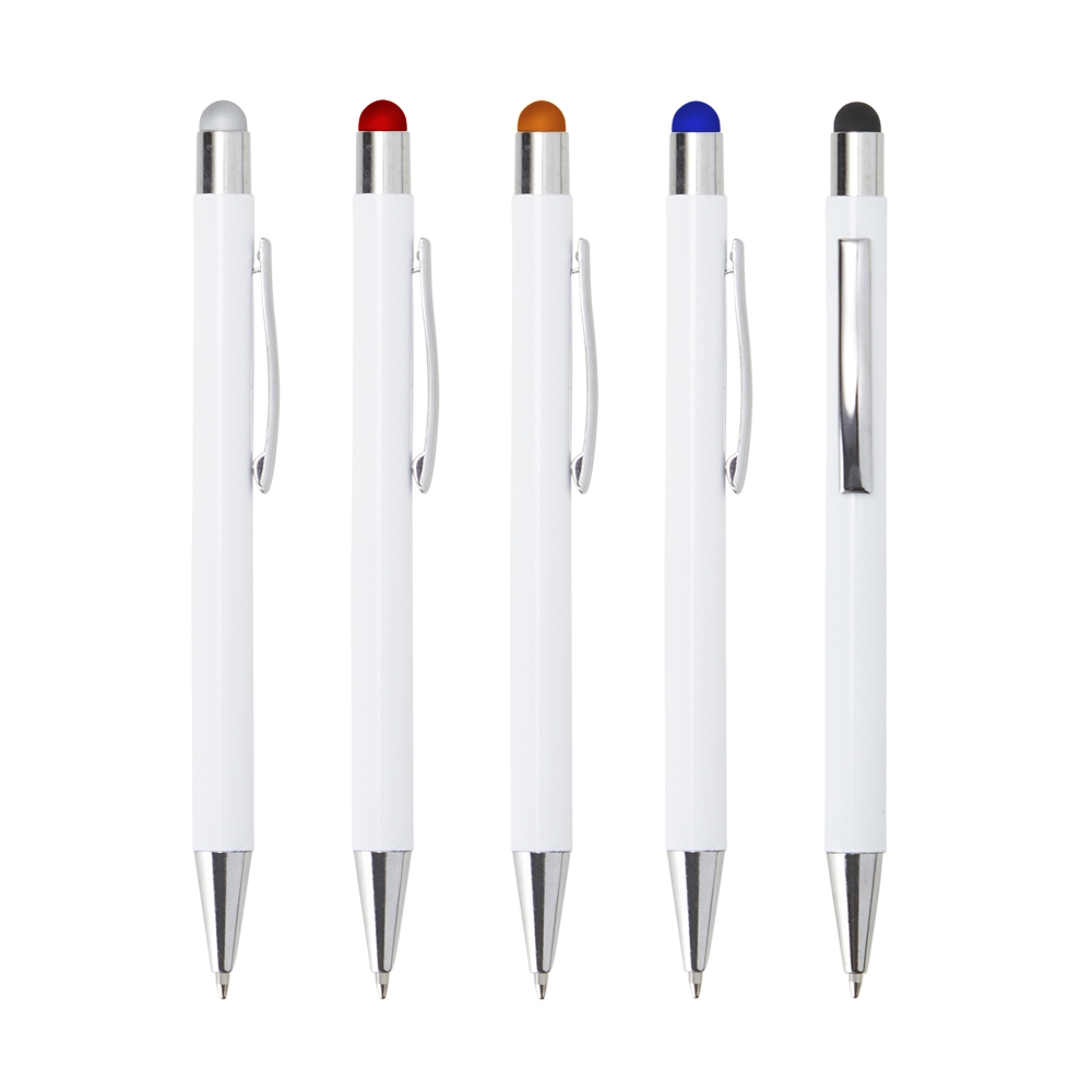 Caneta metálica touchscreen com carga esferográfica azul 1.0mm e acionamento por clique.