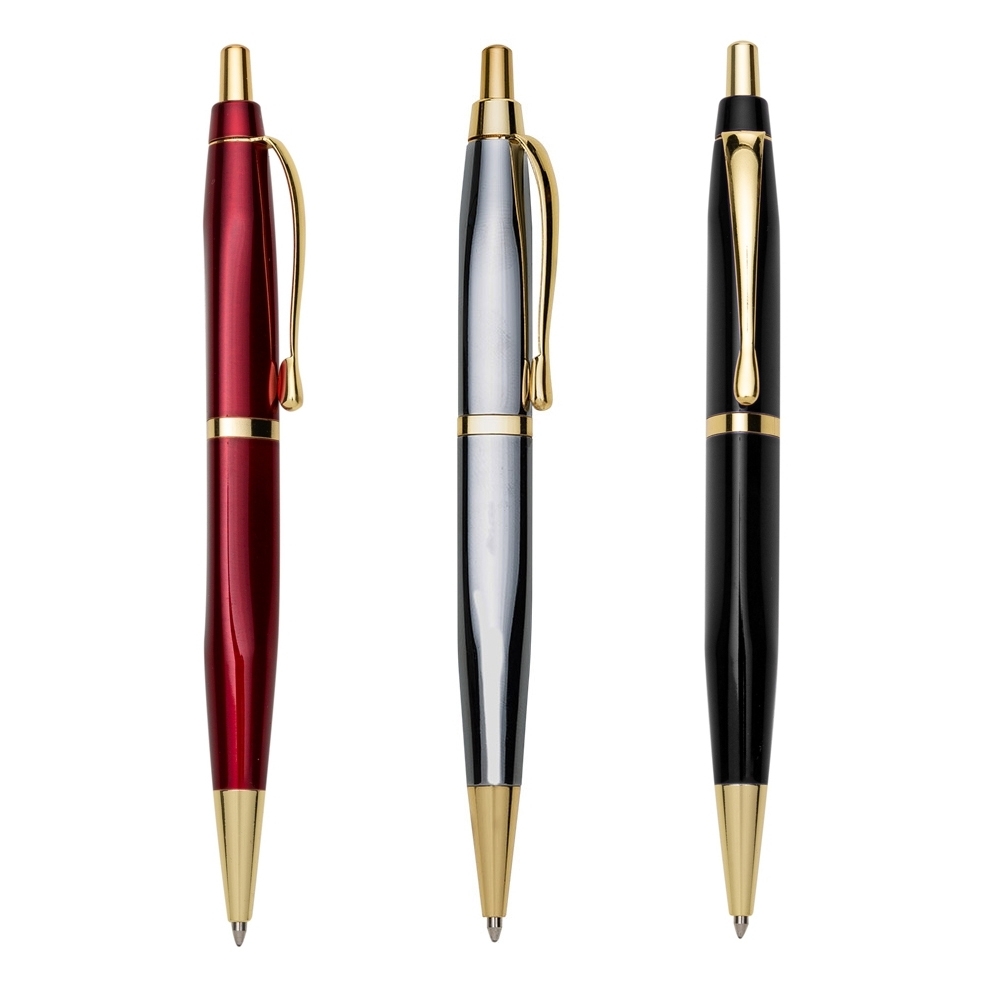 Caneta metal triangular com pintura colorida e detalhes dourados. Clip metálico, acionador, anel e ponteira dourada. Aciona por clique. OBS.: PEDIDO APENAS MÚLTIPLO DE 50 PEÇAS!
