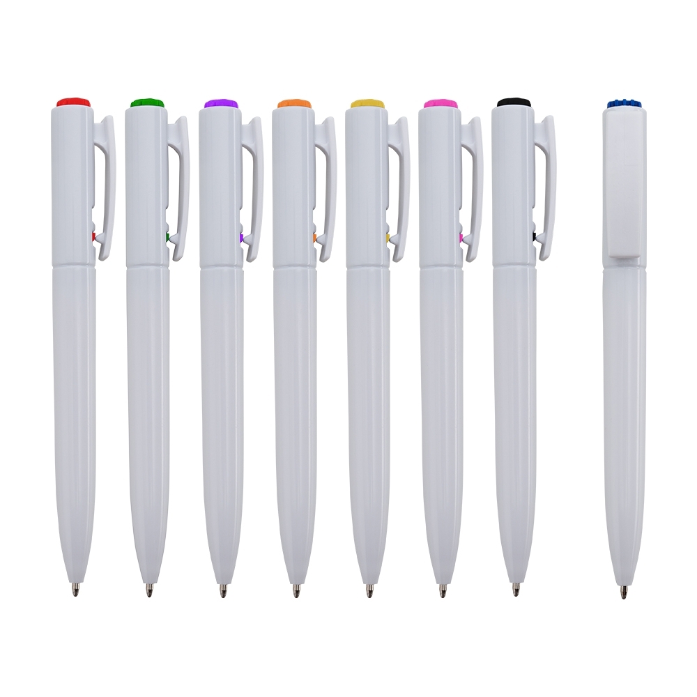 Caneta plástica com carga esferográfica azul e acionamento por clique.