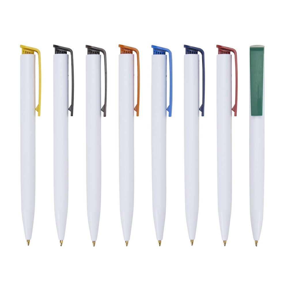 Caneta plástica com carga esferográfica azul e acionamento por clique.
