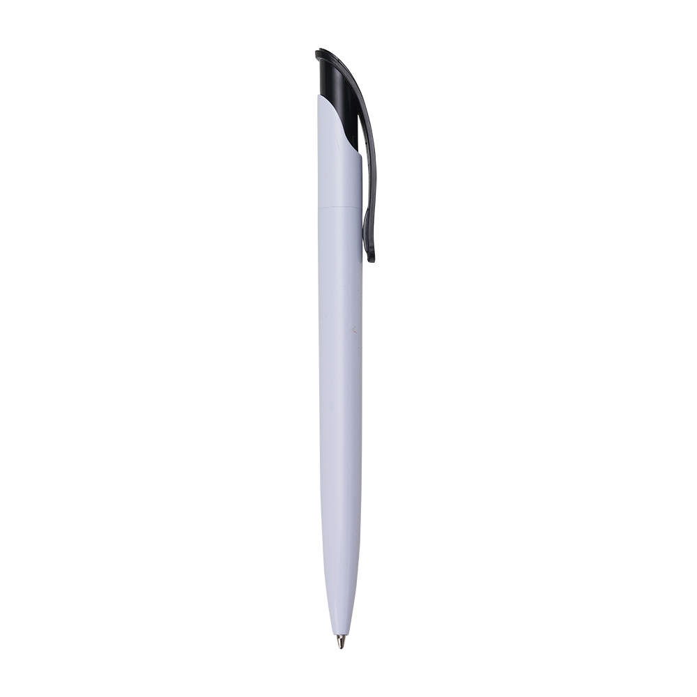 Caneta plástica com carga esferográfica azul e acionamento por clique.