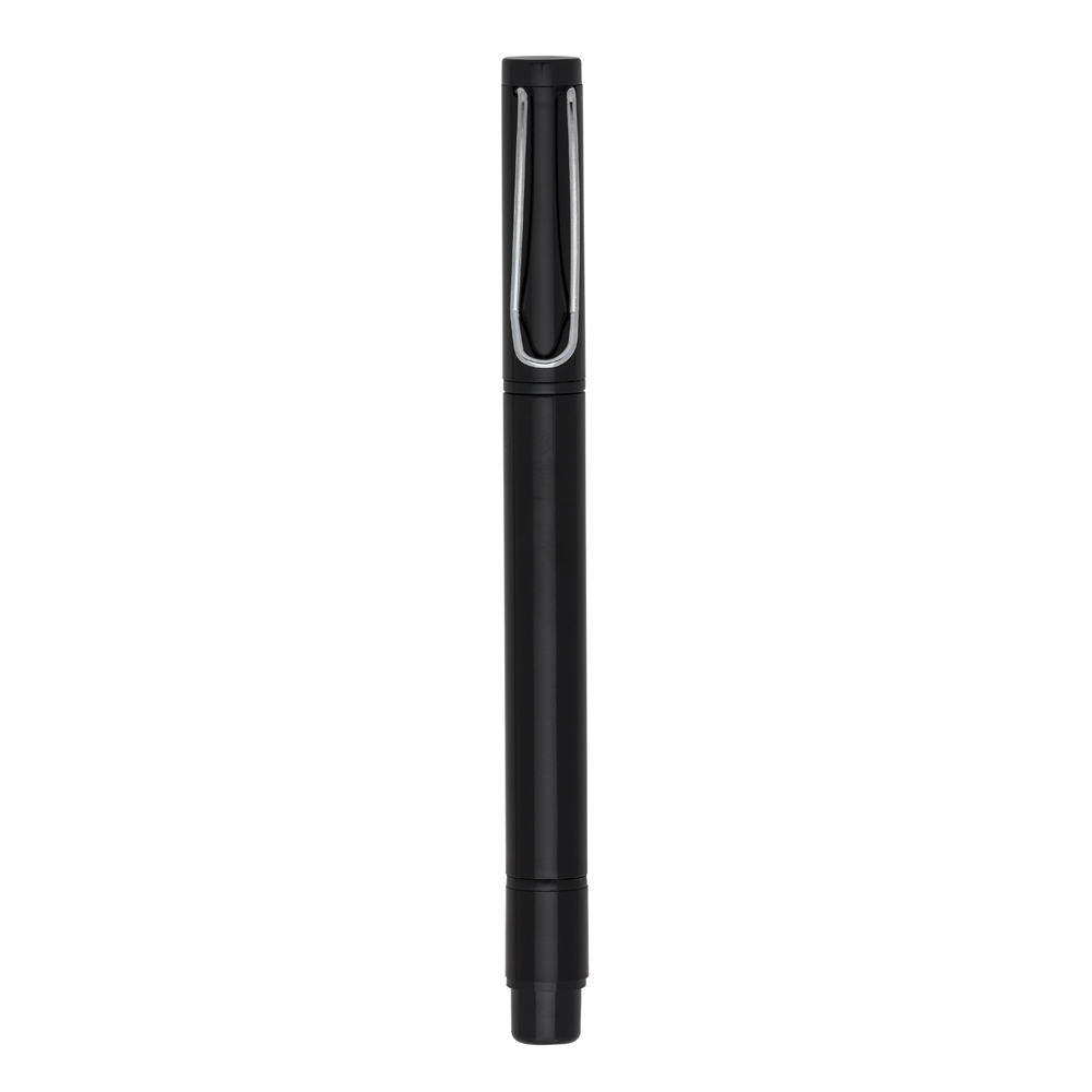 Caneta plástica com marca texto amarelo e carga esferográfica azul, ambas com tampas protetoras.