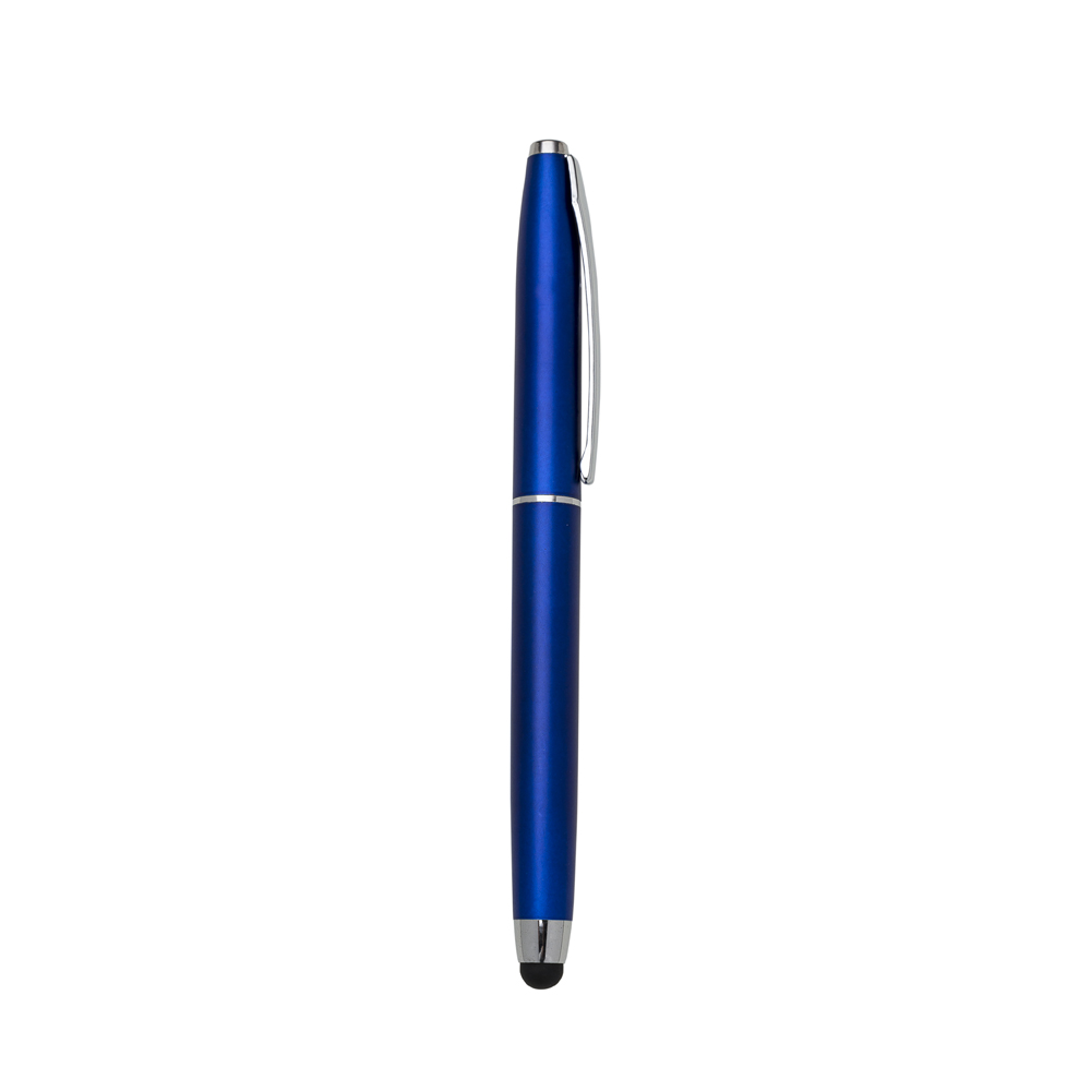 Caneta plástica com tampa e touch screen, carga esferográfica azul.