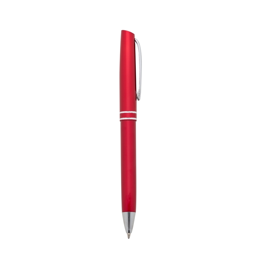 Caneta semimetálica, carga esferográfica azul e acionamento por clique.