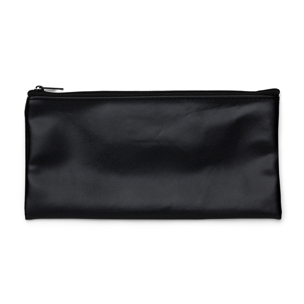 Carteira couro sintético com calculadora solar de 8 dígitos. Carteira preta com detalhes prata na calculadora e botões impressos na capa em branco, possui zíper.