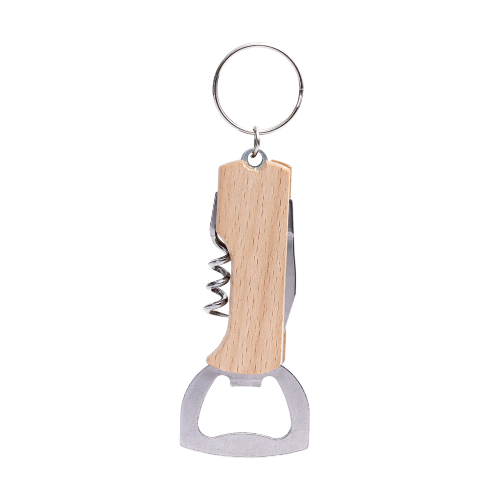 Chaveiro multifunções em madeira com abridor de garrafas, saca-rolhas e lâmina de corte.