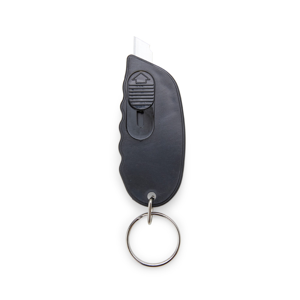 Chaveiro estilete. Sem trava, sendo necessário segurar o botão durante o uso.