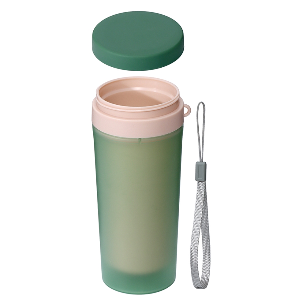 Copo de plástico polipropileno com capacidade para 350ml livre BPA, parede dupla. Acompanha tampa rosqueável e alça de nylon para transporte.