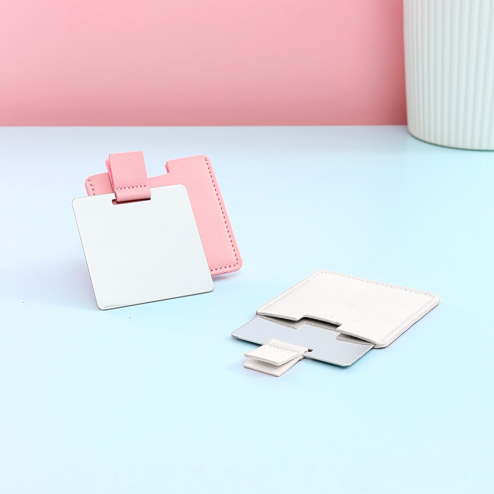 Espelho inquebrável de aço inoxidável ultra fino com verso escovado e alça em couro sintético. Acompanha estojo de couro sintético.