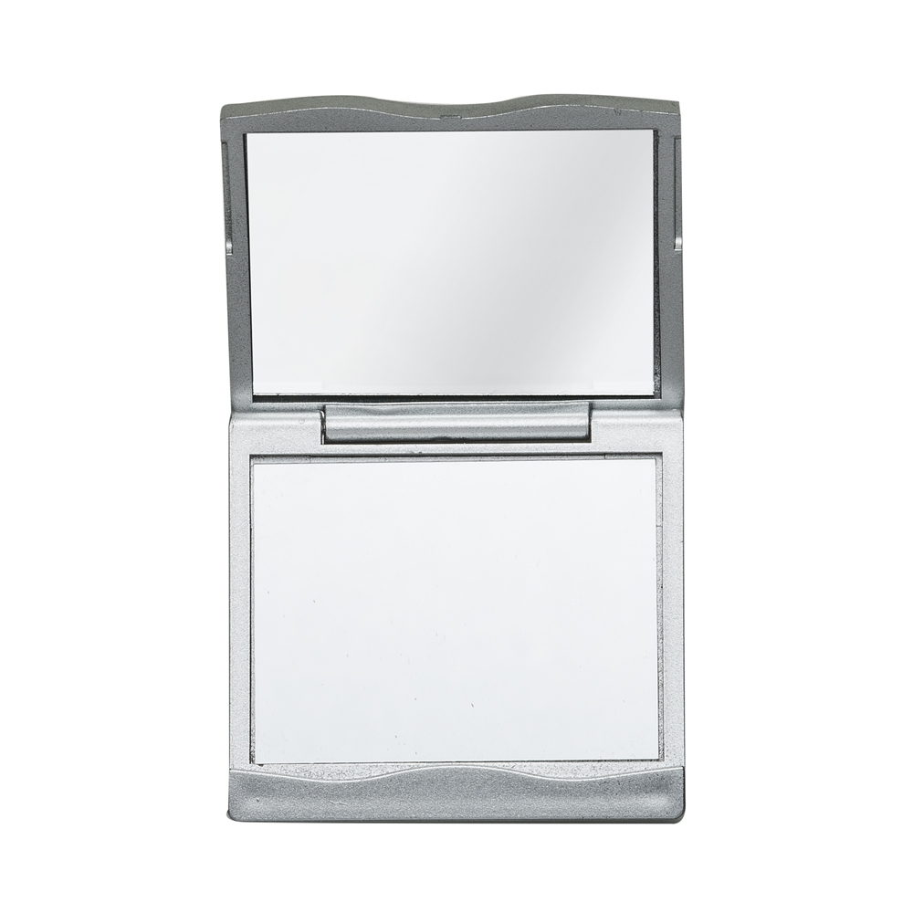 Espelho plástico duplo com aumento. Frente e verso liso porém a parte superior não é plana, possui um detalhe de ondulação.