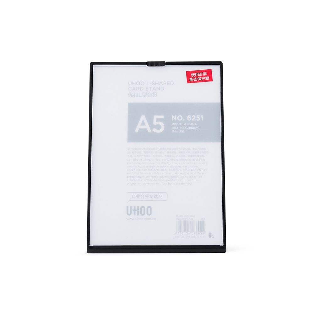 Expositor porta retrato A5 feito em poliestireno com placa acrílica.