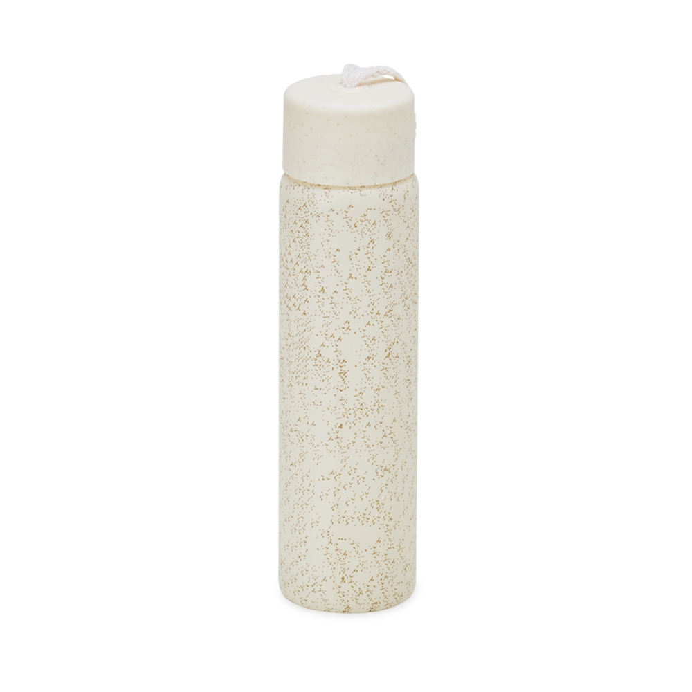 Garrafa de vidro 330ml com acabamento adesivado, tampa plástica e alça de algodão para transporte.