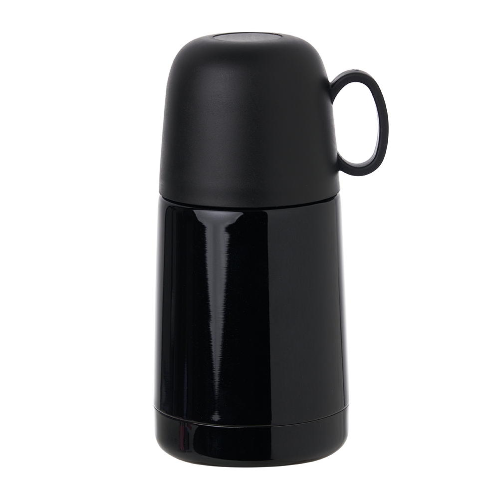Garrafa térmica 230ml com acabamento degradê, contém tampa hermética rosqueável com botão de acionamento e tampa externa plástica com alça, podendo ser utilizada como xícara.