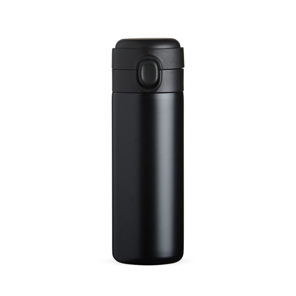 Garrafa térmica em inox com parede dupla, capacidade de 410ml. Tampa com botão central para abertura e borracha interna para vedação.
