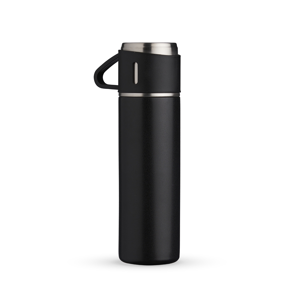 Garrafa térmica 450ml em inox com tampa que pode ser utilizada como caneca, tampa interna em plástico resistente (basta um clique para abrir ou fechar), base com borracha antiderrapante.