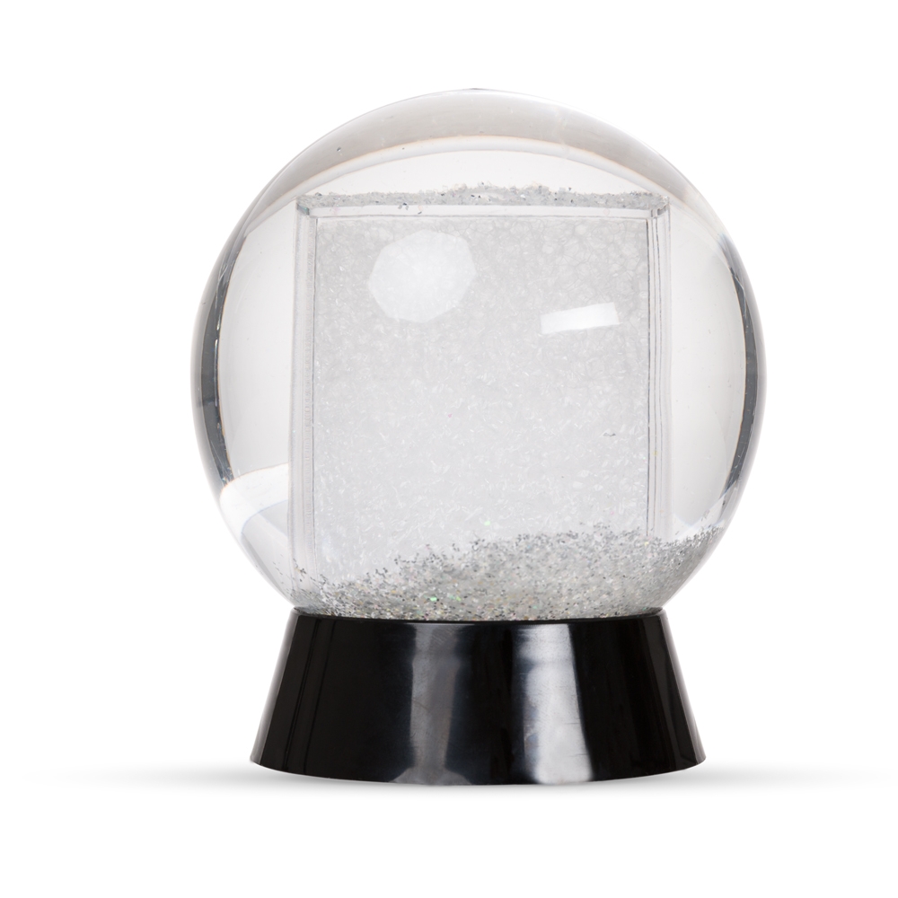 Globo de neve plástico com porta foto. Esfera plástica resistente com glitter na parte interna, base preta pode ser retirada para inserir uma foto no suporte interno. Foto de tamanho 8,5 cm x 4,7 cm.