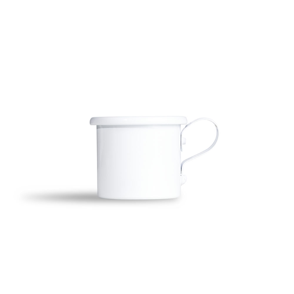 Kit Café 3 Peças contém: xícara de 120ml em metal, base de madeira com suporte para coador, e mini coador de café em tecido.