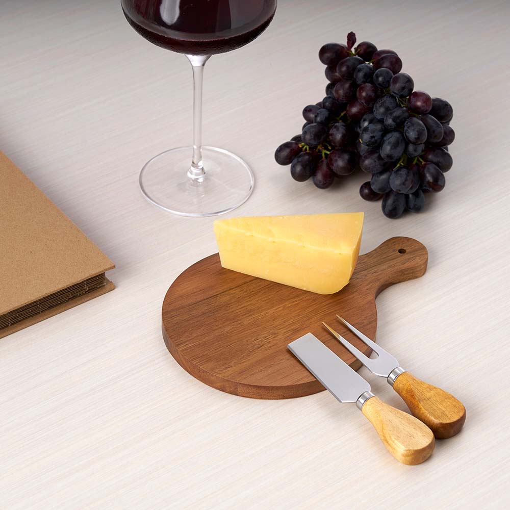 Kit queijo 3 peças em estojo kraft, contém: tábua de madeira redonda, faca reta, e garfo. Tábua com orifício para encaixe.
