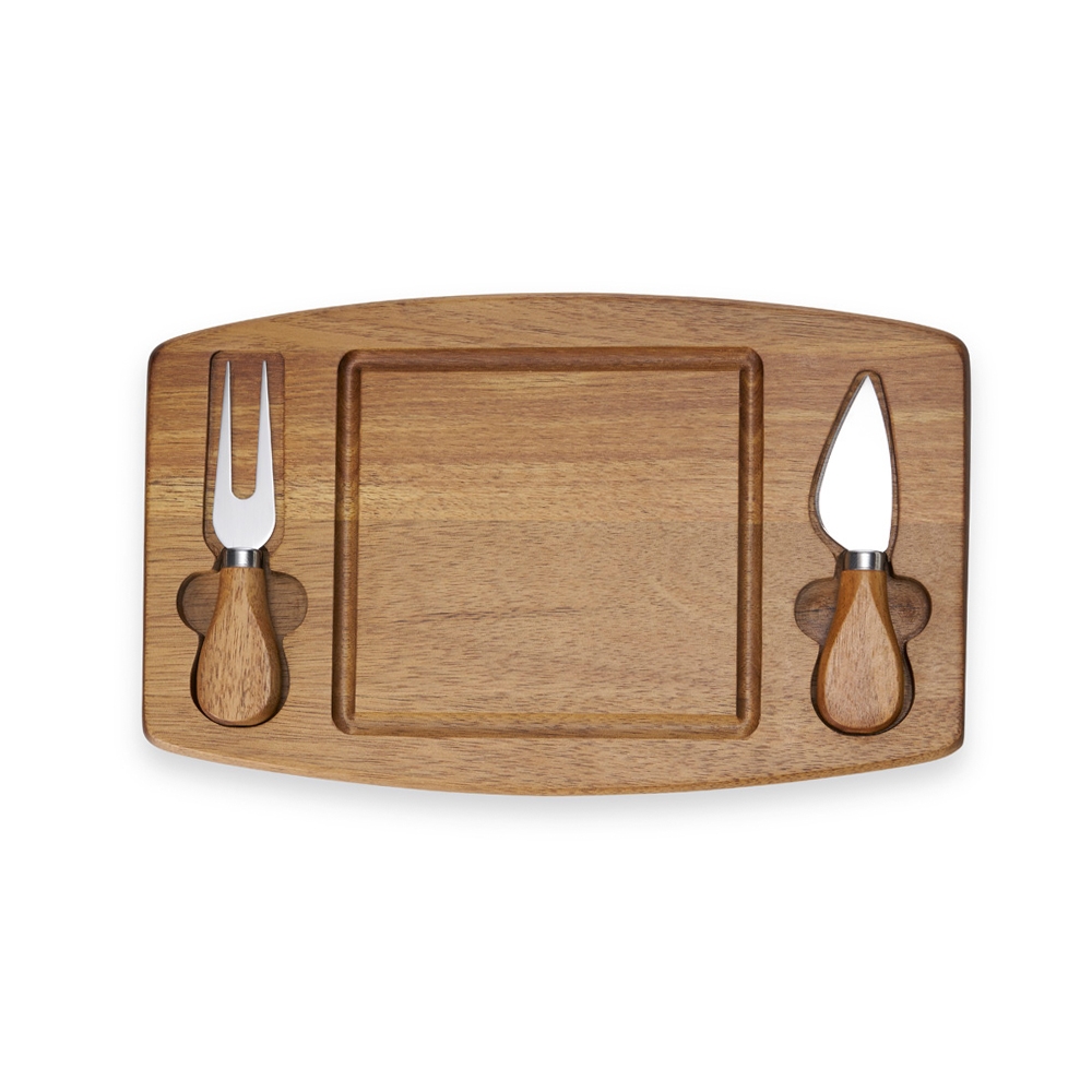 Kit queijo 3 peças, contém: tábua de madeira com canaleta, faca com ponta, e garfo. Tábua com imã para encaixe e fixação dos utensílios.