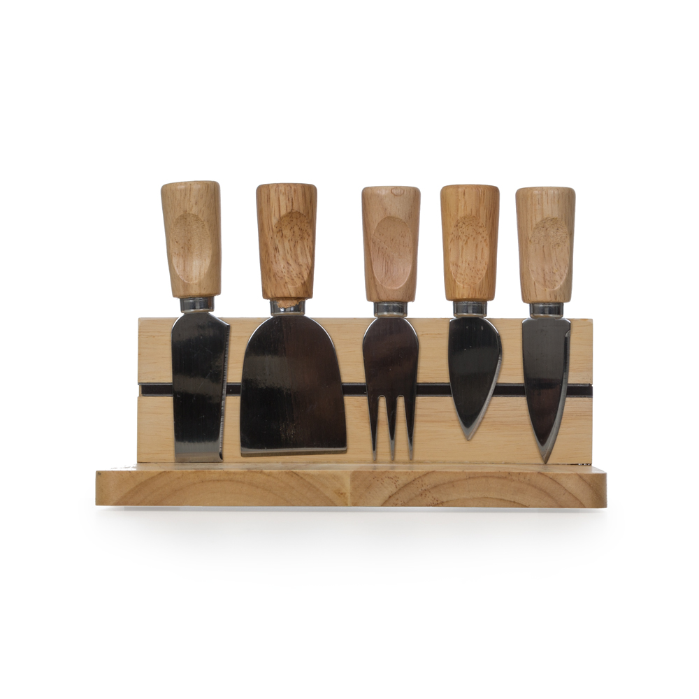 Kit queijo bambu 6 peças, contém: faca reta com ponta, faca com ponta, faca reta, garfo, espátula e tábua de bambu. Há uma linha imãtizada no centro da tábua para posicionar as peças, parte inferior com borrachas anti-deslizantes.