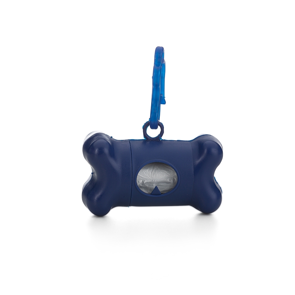 Kit saquinho coletor em formato de osso. Produzido em material plástico, o kit possui abertura lateral para encaixe do rolo e parte frontal vazada com dente plástico, permitindo puxar e destacar os saquinhos. Acompanha mosquetão e rolo de saquinhos.