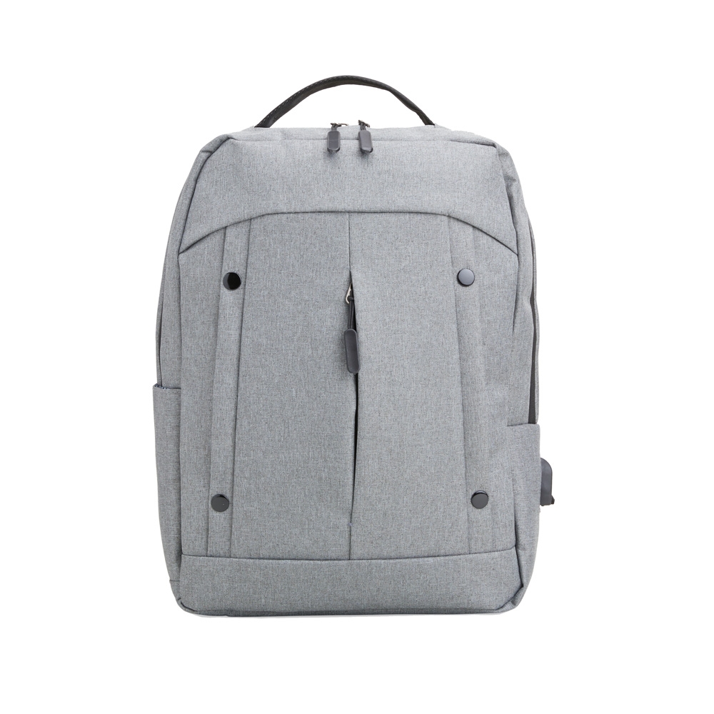 Mochila de nylon 21 Litros com dois compartimentos, sendo o principal com bolso para notebook 15,6. Com divisórias internas para acessórios, a mochila possui bolso lateral, suporte externo USB e alça para engate em malas de viagem.