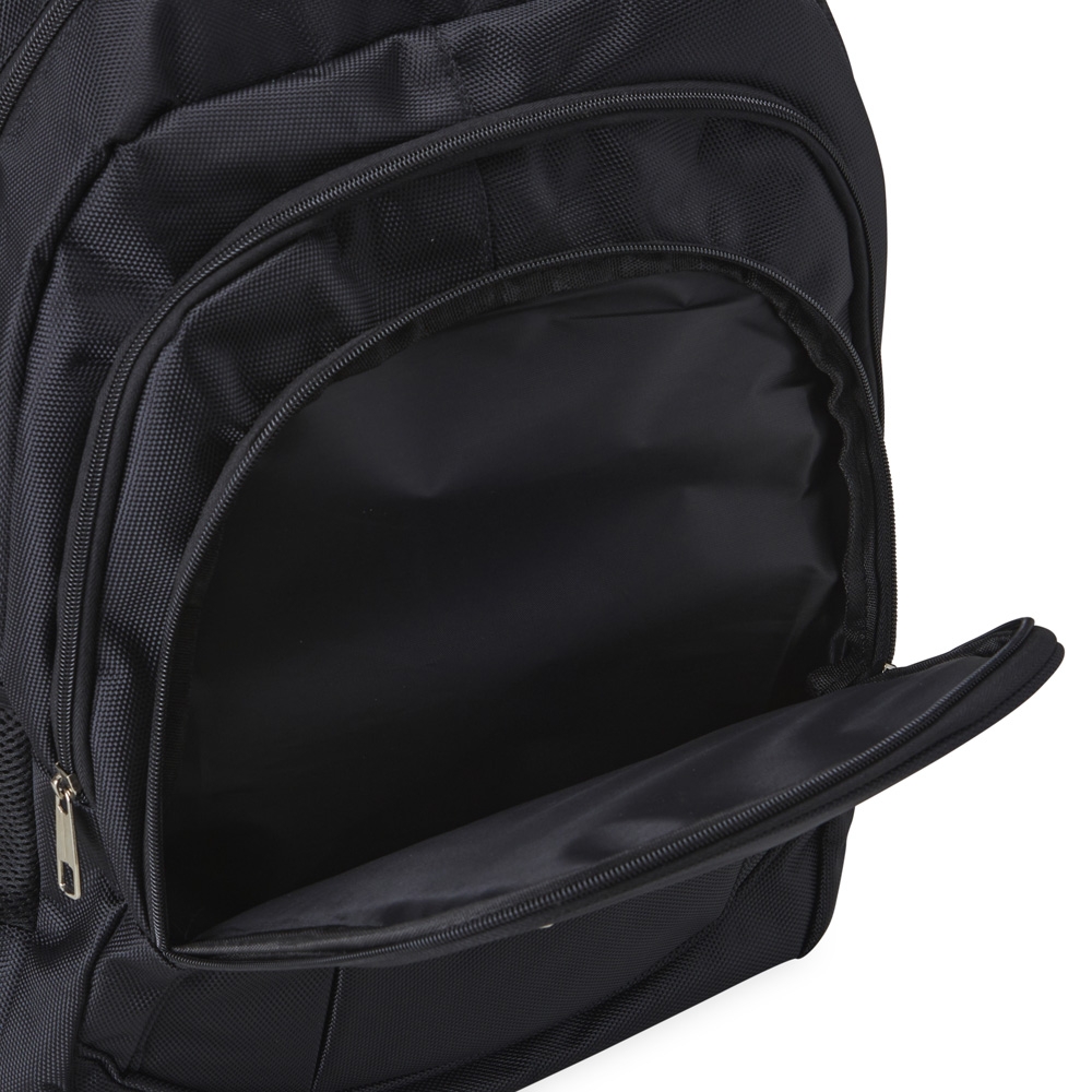Mochila de nylon 30 litros com quatro compartimentos, sendo o principal com bolso para notebook 15,6. A mochila possui bolsos laterais em malha, duas alças de mãos e área costada com revestimento espumado.
