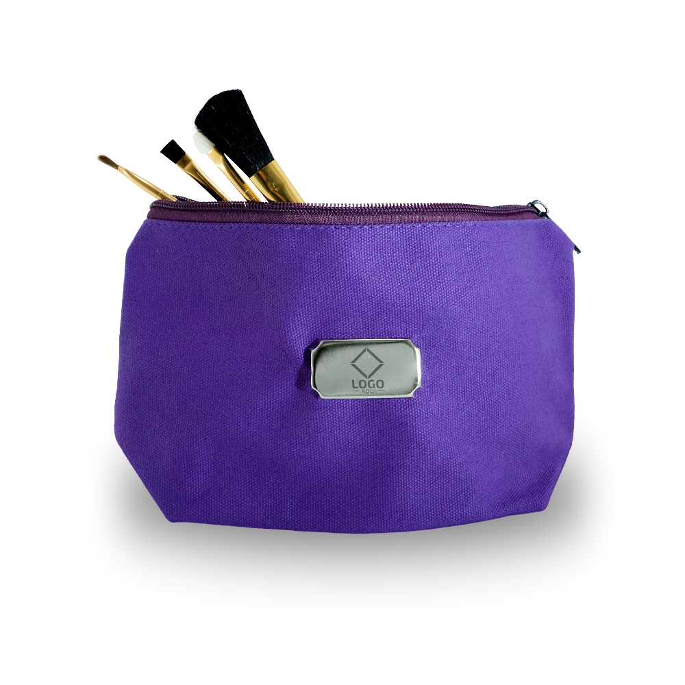 Plaquinha metálica para personalização. Possui acabamento fosco, hastes laterais com ponta na parte traseira, fure o tecido com as próprias hastes e dobre-as para fixação. Imagem com necessaire meramente ilustrativa.