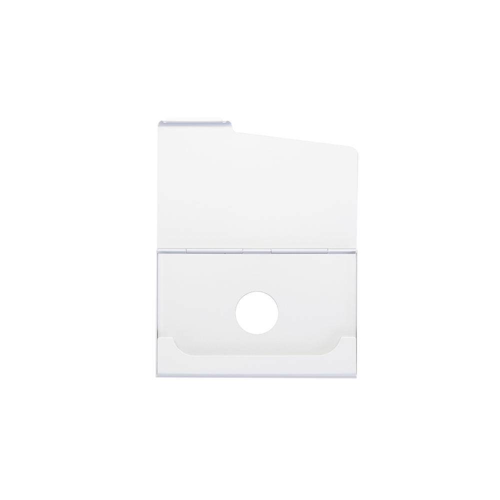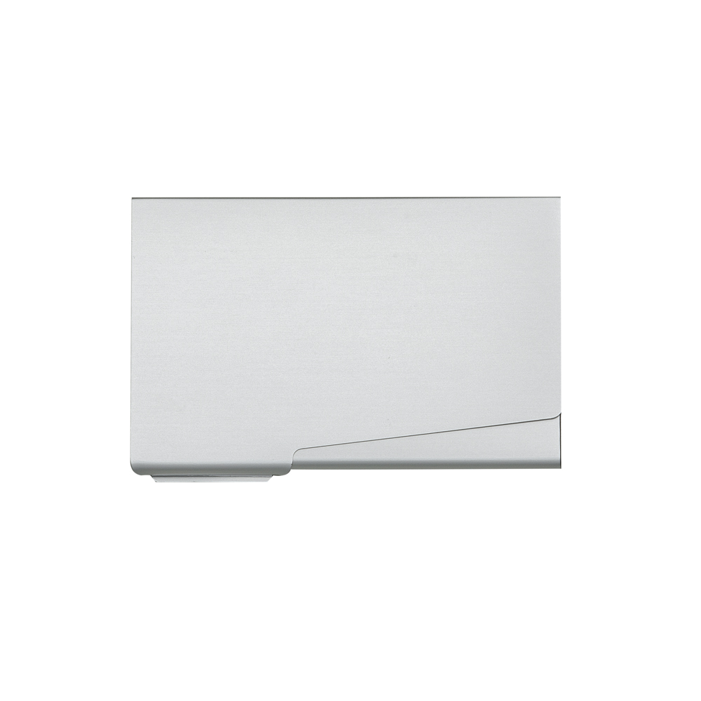 Porta cartão de alumínio, design da abertura em diagonal e com um furo central vazado na parte traseira.