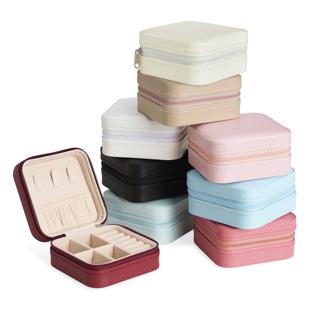 Porta joias de couro sintético com revestimento aveludado. Possui compartimentos internos para anéis, brincos, pulseiras e colares.