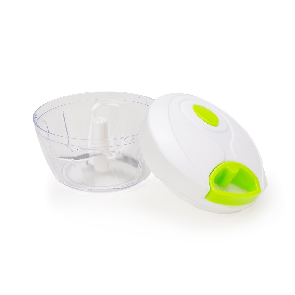 Processador de alimentos manual, tampa plástica de polipropileno com puxador verde, pote transparente em poliestireno com relevo e lâminas em aço inox.