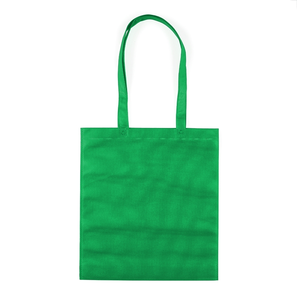 Sacola colorida com alça em material TNT, possui símbolo ecológico/reciclável na costura da alça.
